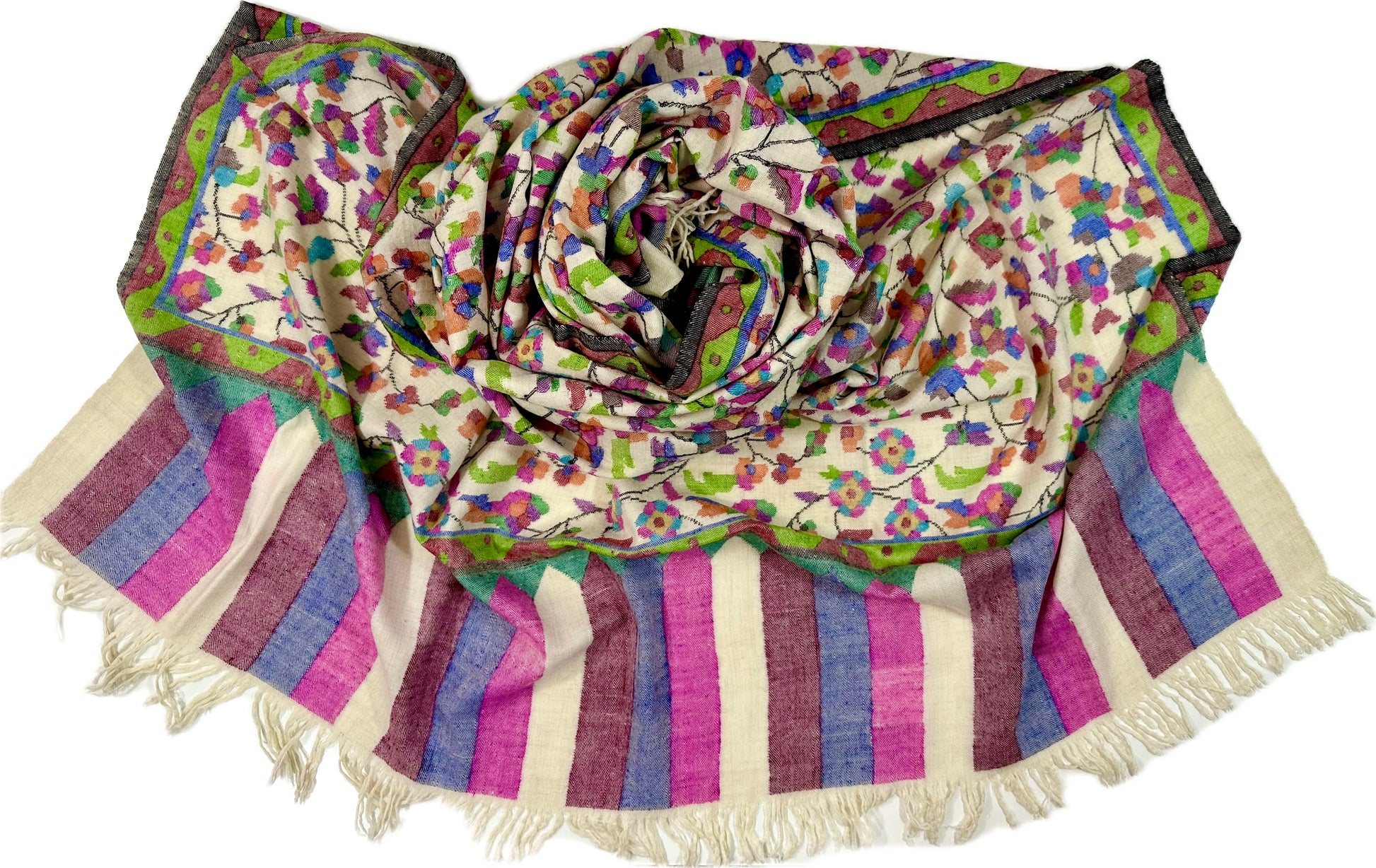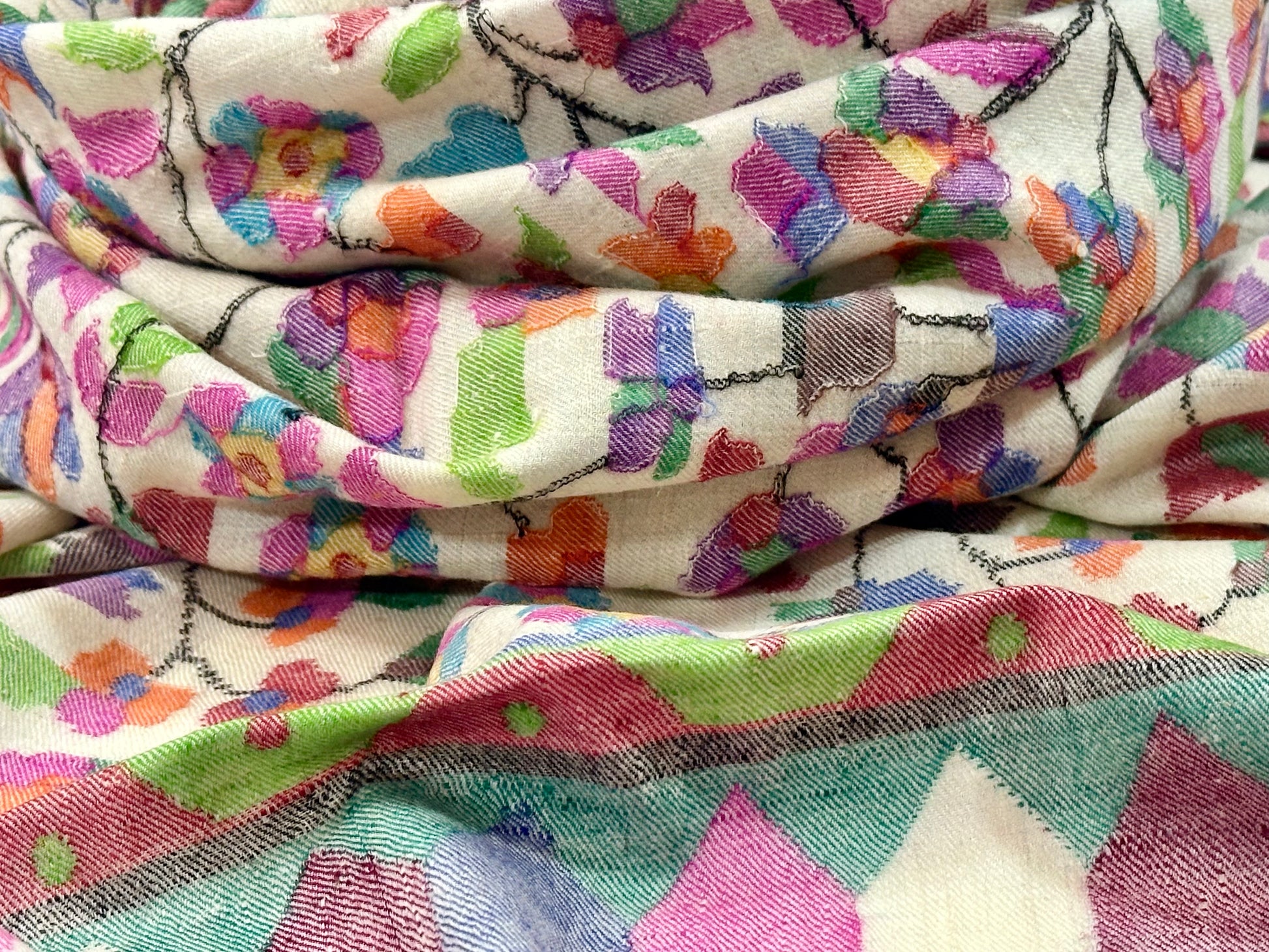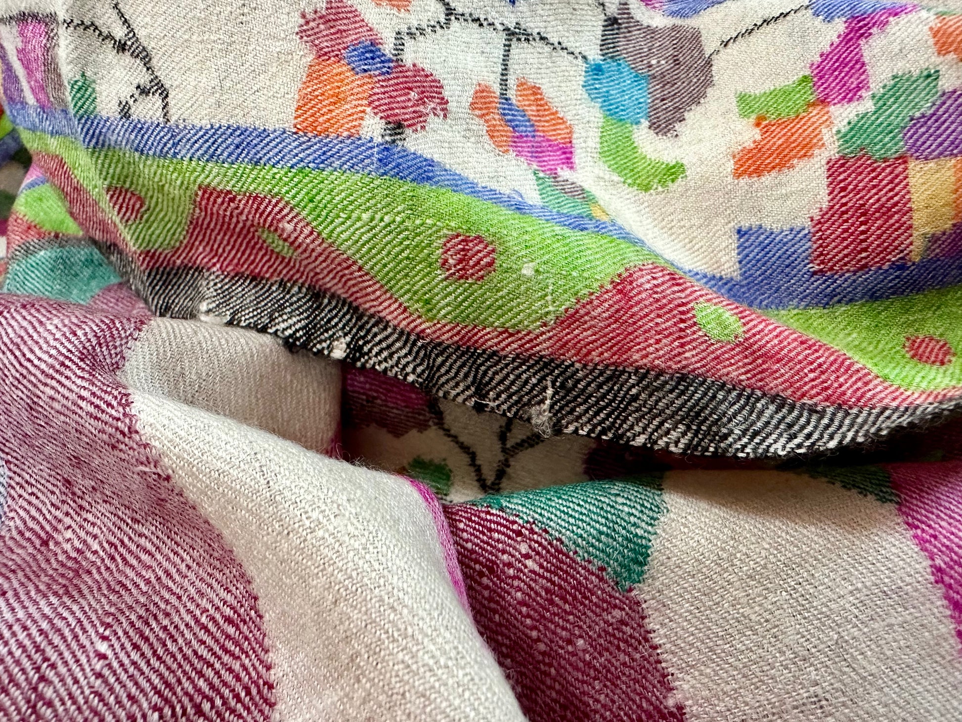 Each shawl is entirely handwoven using small wooden bobbins known as kanis, following a coded design script passed between generations. Unlike printed patterns, every motif is woven into the fabric, thread by thread — the result is a textile with remarkable depth, clarity, and soul.